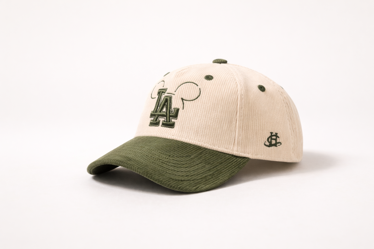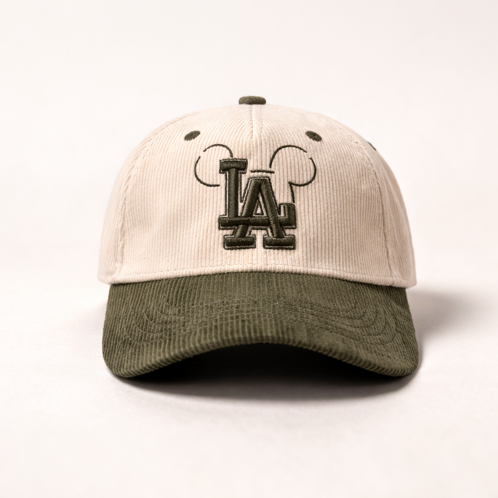This 5-panel corduroy cap pairs a warm cream crown with an olive visor and matching embroidery for a grounded, refined look. The raised detailing adds depth while keeping the overall design clean and versatile.